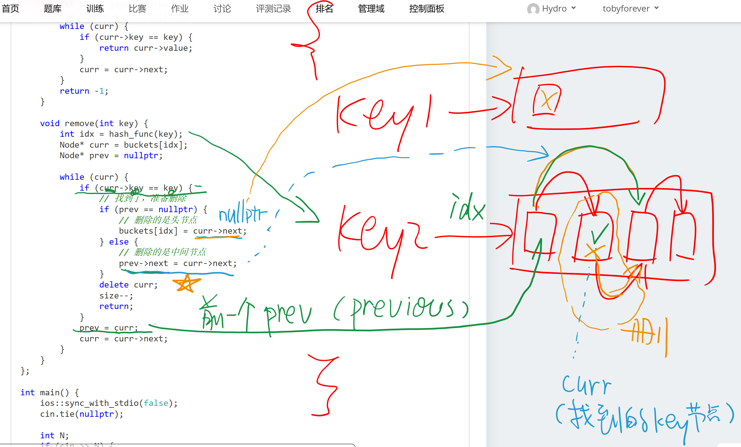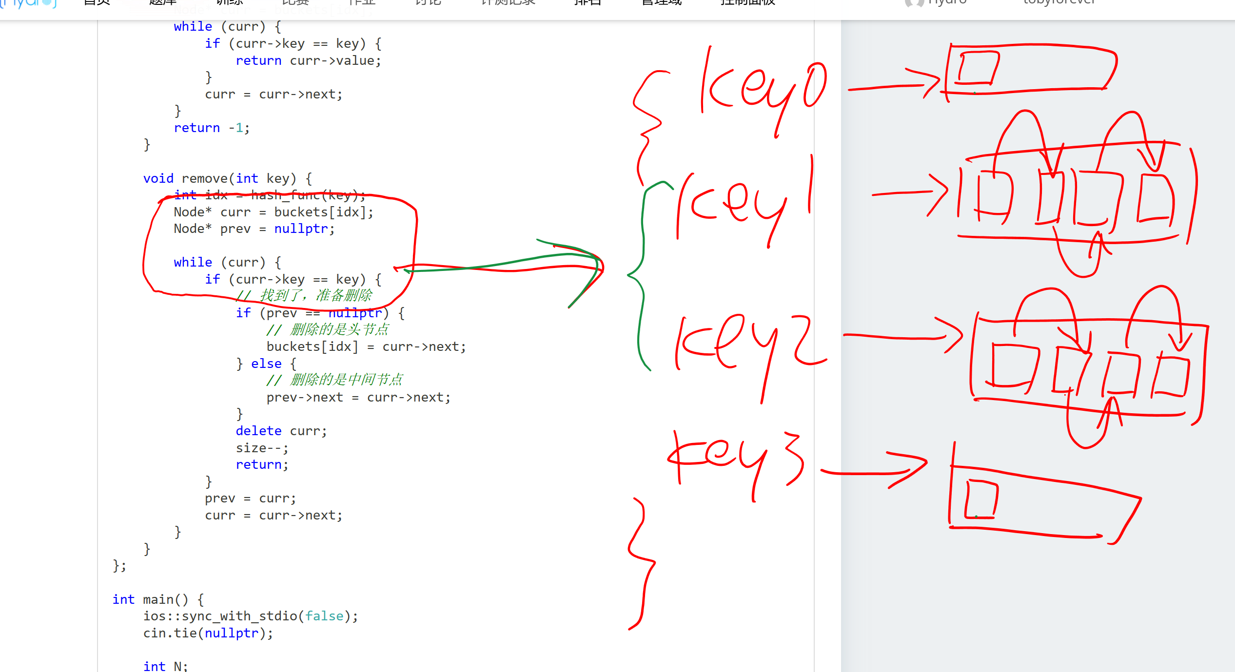 /** * 题目:手写 HashMap 实现原理 (精简教学版) * 语言:C++14 */ #include <iostream> #include <vector> #include <string> using namespace std; // 1. 定义链表节点:用于解决哈希冲突 (拉链法) struct Node { int key; int val; Node* next; // 指向下一个节点 // 构造函数:方便创建新节点 Node(int k, int v, Node* n) : key(k), val(v), next(n) {} }; // 全局变量模拟哈希表 vector<Node*> buckets; // 桶数组 (存放链表头指针) int capacity = 16; // 初始容量 int num_elements = 0; // 当前元素个数 // 2. 扩容函数 (Rehash) - 核心难点 void resize() { int old_cap = capacity; capacity *= 2; // 容量翻倍 // 保存旧桶,创建新桶 vector<Node*> old_buckets = buckets; buckets.assign(capacity, nullptr); // 重置并扩大桶数组,初始化为空 // 遍历旧桶中的所有节点,搬家到新桶 for (int i = 0; i < old_cap; i++) { Node* curr = old_buckets[i]; while (curr != nullptr) { Node* next_node = curr->next; // 先记录下一个节点,防止断链 // 重新计算哈希值 (因为 capacity 变了) int new_idx = curr->key % capacity; // 头插法搬入新家 curr->next = buckets[new_idx]; buckets[new_idx] = curr; curr = next_node; // 继续处理旧链表的下一个 } } } // 3. 插入/更新操作 (Put) void put(int key, int val) { int idx = key % capacity; Node* curr = buckets[idx]; // 遍历链表,看 key 是否已存在 while (curr != nullptr) { if (curr->key == key) { curr->val = val; // 存在则更新值 return; } curr = curr->next; } // 不存在,创建新节点并使用"头插法"插入 buckets[idx] = new Node(key, val, buckets[idx]); num_elements++; // 检查负载因子:如果 元素数量 > 容量 * 0.75,则扩容 if (num_elements * 1.0 / capacity > 0.75) { resize(); } } // 4. 查询操作 (Get) int get(int key) { int idx = key % capacity; Node* curr = buckets[idx]; while (curr != nullptr) { if (curr->key == key) { return curr->val; // 找到返回 value } curr = curr->next; } return -1; // 没找到 } // 5. 删除操作 (Remove) void remove(int key) { int idx = key % capacity; Node* curr = buckets[idx]; Node* prev = nullptr; // 记录前驱节点 while (curr != nullptr) { if (curr->key == key) { // 找到了,准备删除 if (prev == nullptr) { // 删除的是头节点 buckets[idx] = curr->next; } else { // 删除的是中间节点 prev->next = curr->next; } delete curr; // 释放内存 num_elements--; return; } prev = curr; curr = curr->next; } } int main() { // 优化 I/O 速度 ios::sync_with_stdio(false); cin.tie(nullptr); // 初始化桶数组 buckets.assign(capacity, nullptr); int N; cin >> N; while (N--) { string op; cin >> op; int x, y; if (op == "put") { cin >> x >> y; put(x, y); } else if (op == "get") { cin >> x; cout << get(x) << "\n"; } else if (op == "remove") { cin >> x; remove(x); } } return 0; }👨💻 初学者学习重点 (代码解析)